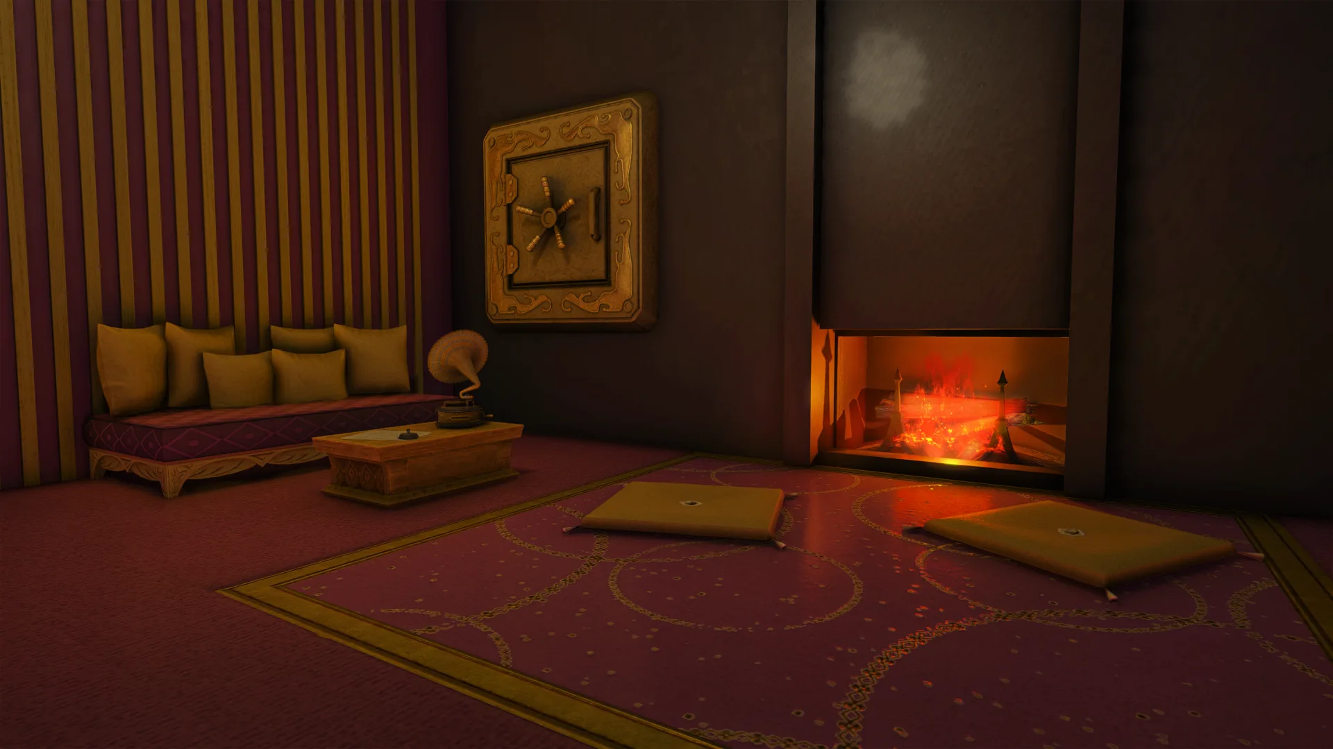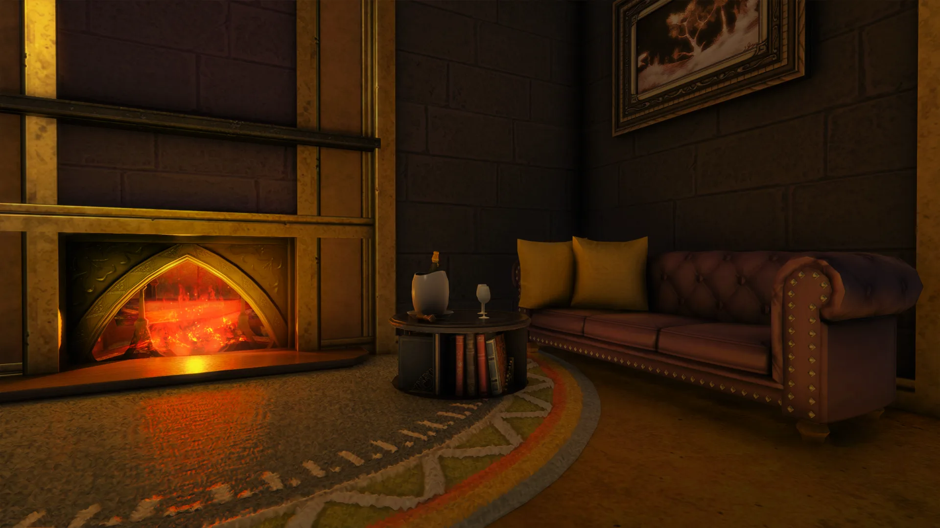 A romantic refuge of fur and firelight. Gilded stone and candlelit walls cradle a roaring hearth, where warmth softens every word and closeness blooms in the hush of embers.