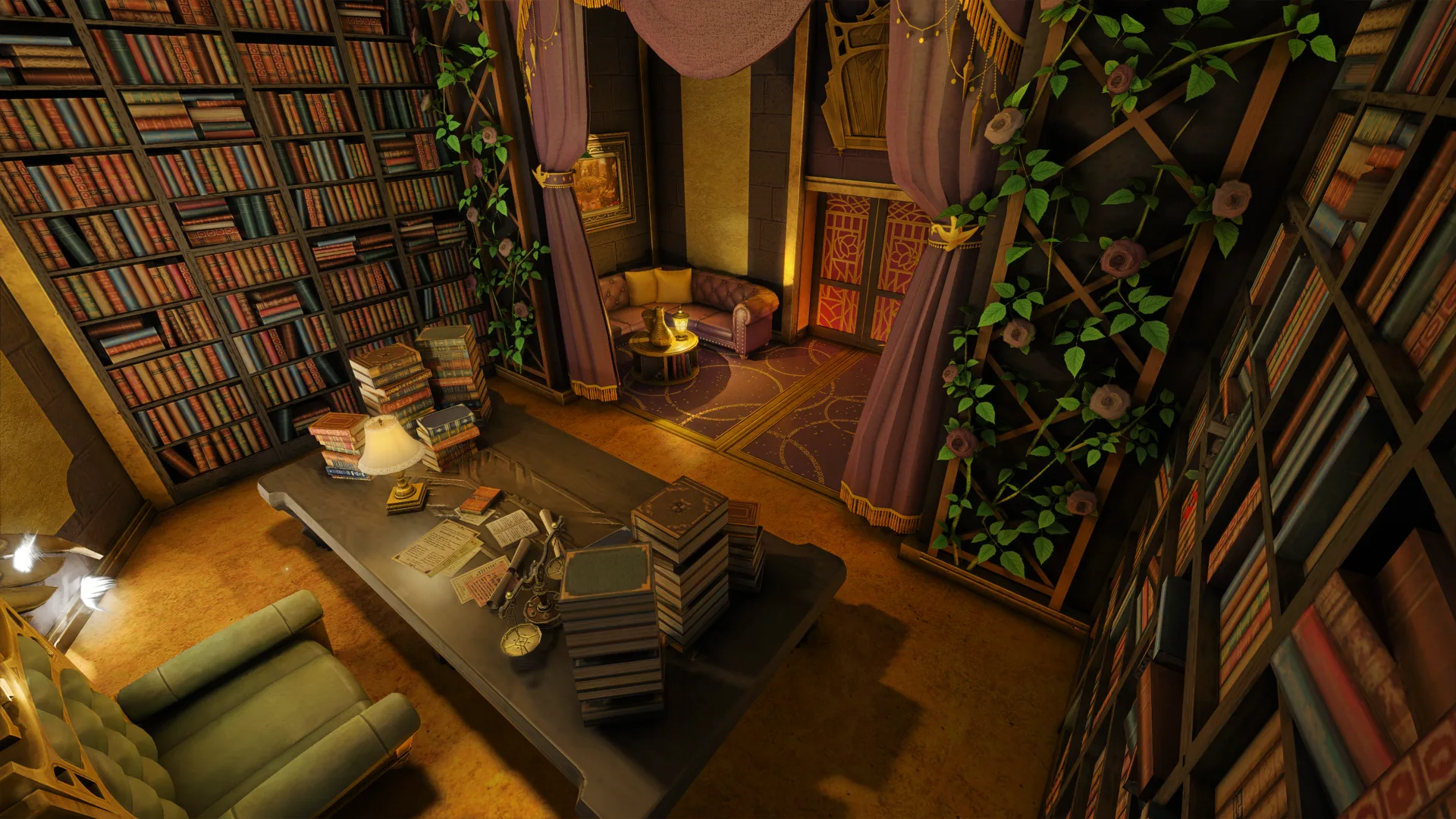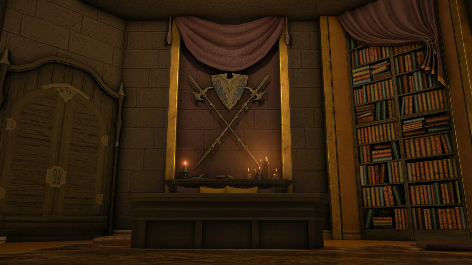 A lordly study of fur and flame. Crossed blades, towering bookshelves, and a roaring hearth guard an intimate refuge of whispered authority.