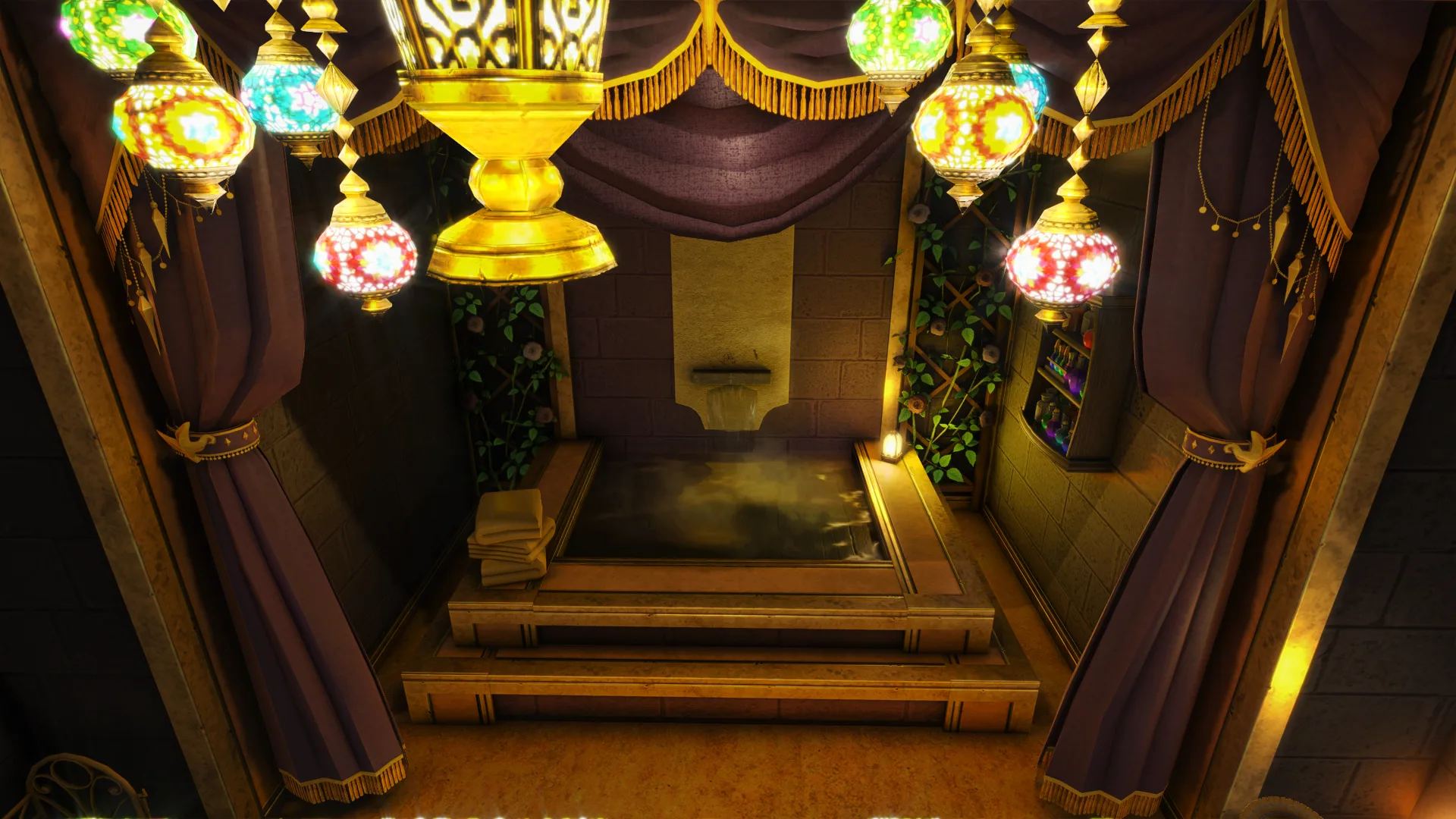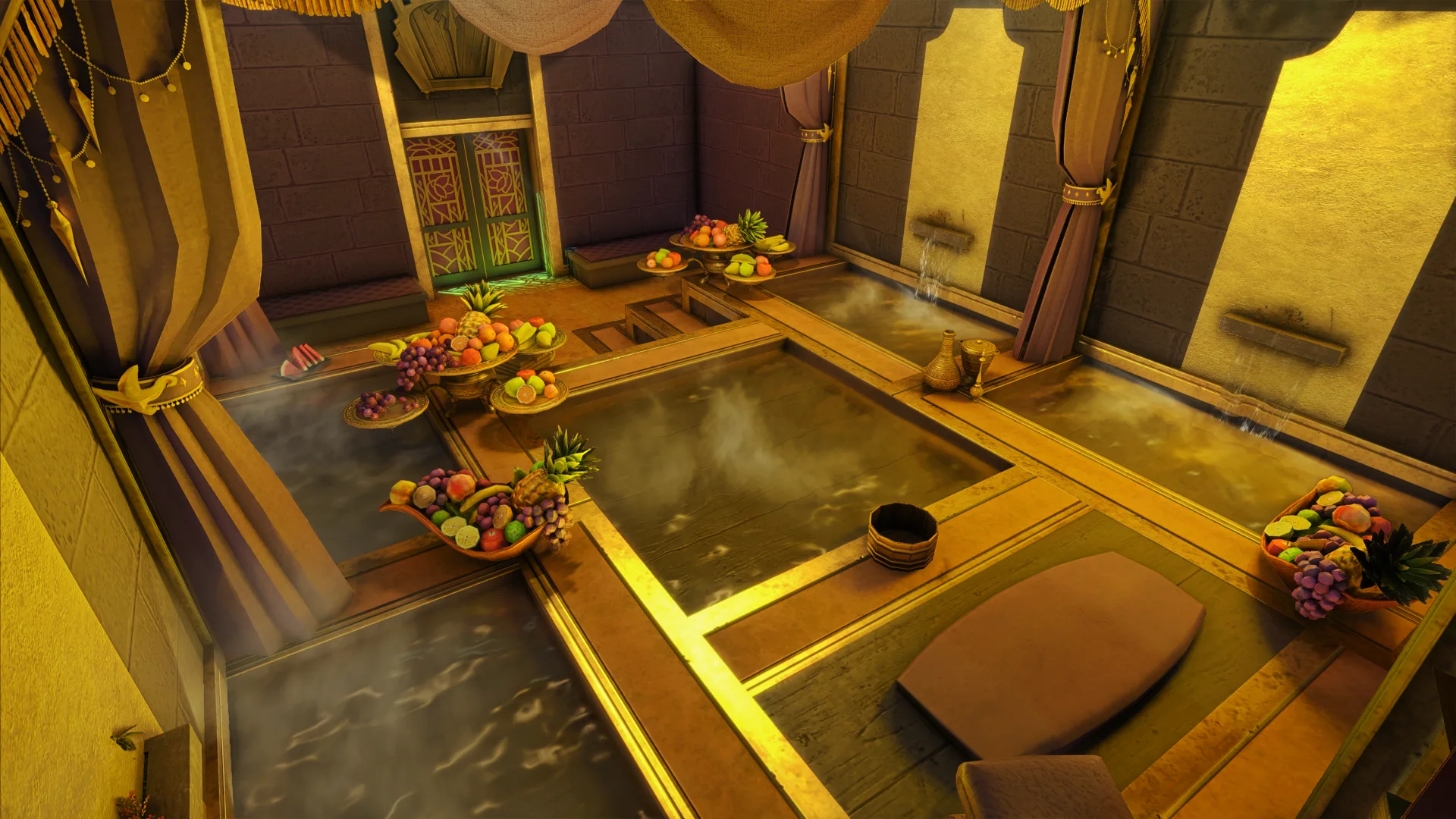 A secluded bathhouse of hot pools, thick steam, fruit platters, and silk-draped privacy.