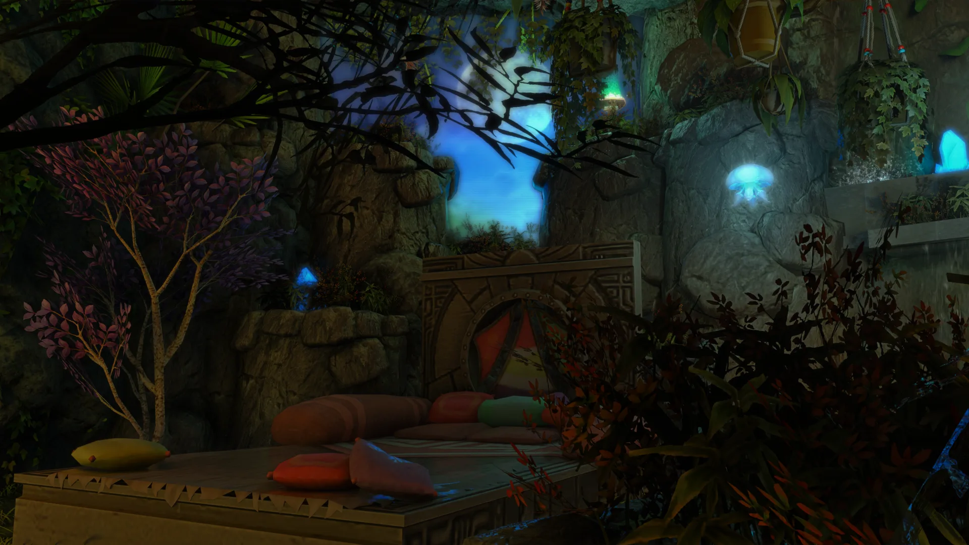 An enchanted cave of moss and bloom. Stone walls draped in vines, lit by magic crystals.